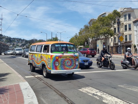 Vimos la típica furgoneta hippie que, por lo visto, están utilizando algunas empresas para hacer tours de lo más pintorescos.